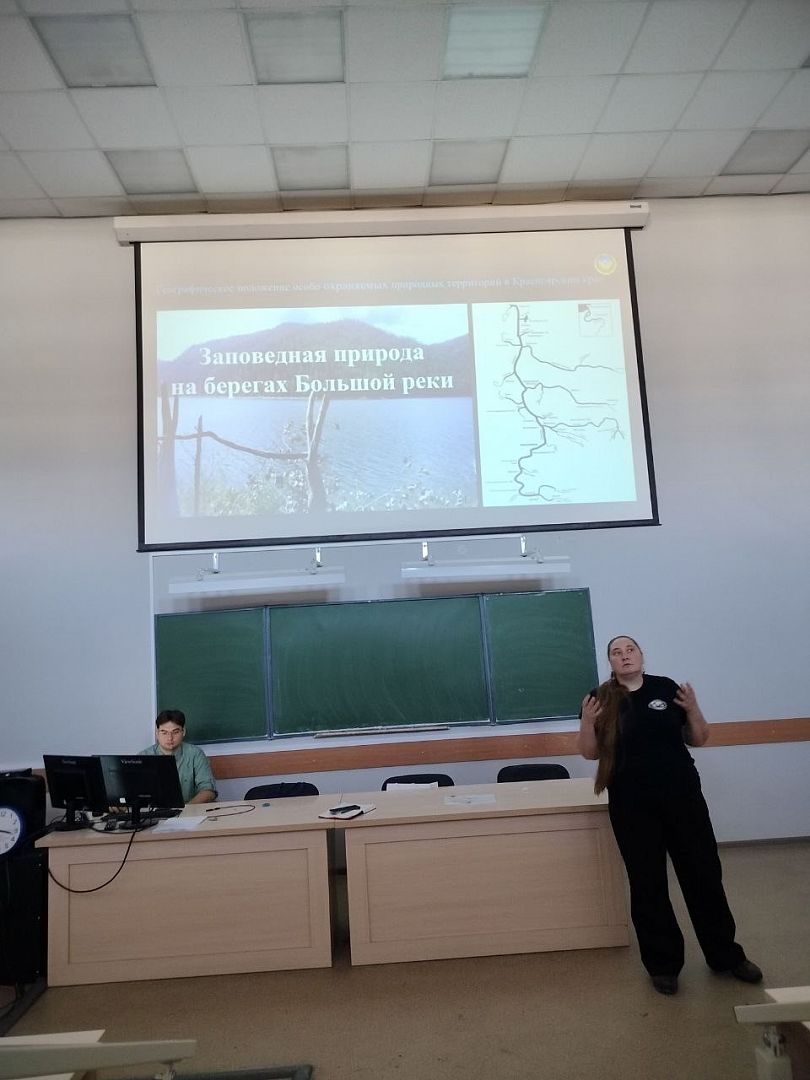 Татьяна Родин-Сова в своей лекции сравнила речные бассейны Оби и Енисея и рассмотрела заповедные территории, расположенные в их границах. Студенты-географы и природопользователи 1, 3 и 4 курсов внимательно слушали гостью из Восточной Сибири и отвечали на разные вопросы. А самые активные участники мероприятия получили памятные призы.