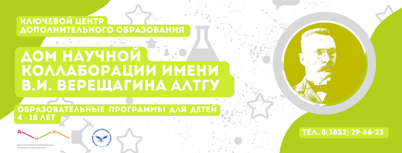 Дом научной коллаборации имени В.И. Верещагина — ключевой центр дополнительного образования на базе Алтайского государственного университета, созданный в рамках федерального проекта «Успех каждого ребенка» (национальный проект «Образование») при поддержке Министерства образования и науки Алтайского края.